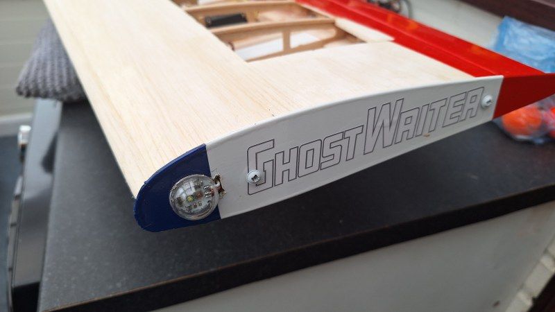 Next was the wing. Again I was going to get away with only stripping off the white and blue. However, with the covering now off I was now able to insert cables to power some position LED Navlights I had made up into the wing tips. Now I could move on to the main job of recovering the wing. Before that though I had to fix some small dents in the leading edge from the "incident" back 6 years ago which tore off the engine and the first two formers but I managed to rebuild it luckily.
