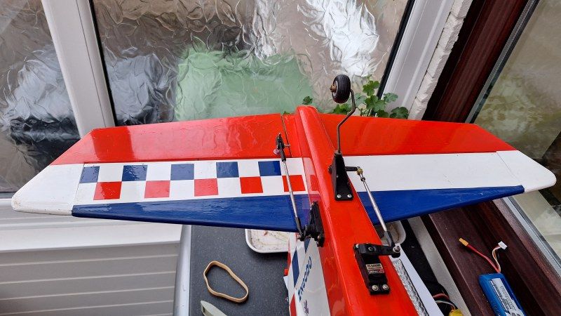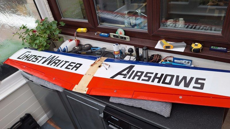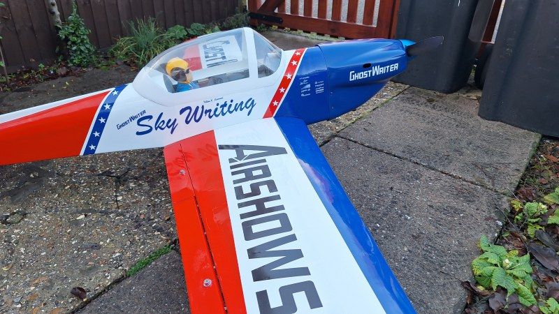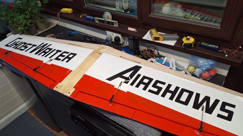 First job was to put right the wing seat saddle curvature that I had inadvertently made wrong at the build stage years ago then remove the canopy by using a sharp knife to carefully slice through the clear silicon that was securing it then strip back all the fuselage white and blue covering leaving only the red areas which were in good order. The covering came off easily with some heatgun work left virtually no residue unlike Solarfilm/Monokote mentioned in the Pennzoil N114V story. Recovered the fuselage with Oracover white and the forward end with Oracover Blue 52. Next job was to apply the graphics supplied by Callie Graphics in Magdelena, New Mexico. Looking good. Although I had to make up the blue and red stripes with white stars myself using Oracover film and some white stars I had in stock due to my cock up when starting to apply then. The adhesive is good but seems to attract itself to the surface before I was ready. Bah!