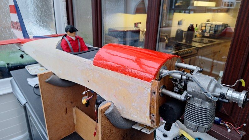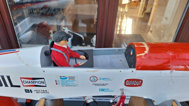 I also noticed that the bubble canopy had acquired a crack so purchased another one from SLEC, the original kit maker and also a pair of spats just in case I break them some time in the future. After cutting off the excess plastic on the canopy then the not much fun masking up the canopy, a bit fiddly but once happy with mask tape edges, a coat of white primer followed by two light coats of gloss white. Once the paint had dried a few hours later I then demasked and did a test fit on the fuselage. The original canopy was secured by six small screws but I found that over time with the vibration from the engine the screws would losen and wear bigger holes in the plastic. So, as per Pepsi/Ghost Writer I will glue it with a small beads of clear silicon - makes for invisible security and smooth lines. Can always be cut through if necessary with a scalpel.