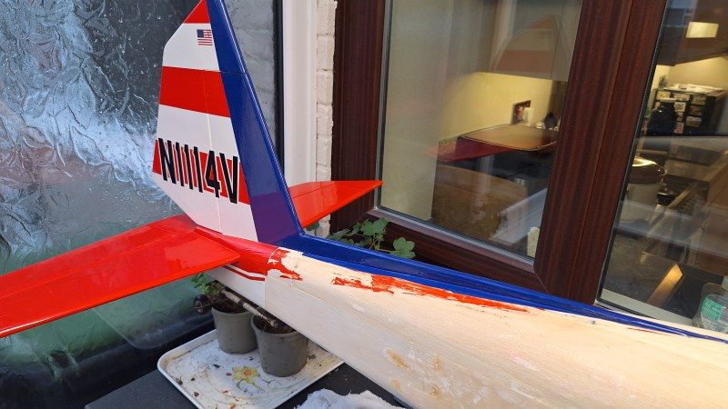 To same some time I left the tail, stabiliser and elevator as original (except a small patch here and there where the film had lifted - see last image where the stabilser righthand side has been recovered but not really noticable against the elevators monokote covering). All the fuselage sides that where white was recovered and replaced the upper fuselage red and blue spine. The fuel dot was replaced with a nice new shiny aluminium one.