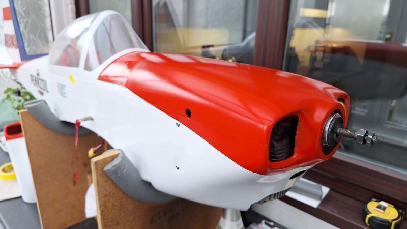The cowl was flatted down with wet n dry 400 then 1200 and the lower half was resprayed with Appliance White (Halfords). Then mask off white to respray the top half with RC Colours Red 22. I have had issues with RC Colours before with spluttering spray patterns and blobbing. As it takes a couple of days to harden before it can be wet n dryed down. So with a brand new can and giving RC Colour the benefit of the doubt I attempted to respray. Ghiant RC colours needs a kick up the proverbial. This can would not even depress the nozzle button. Give up!