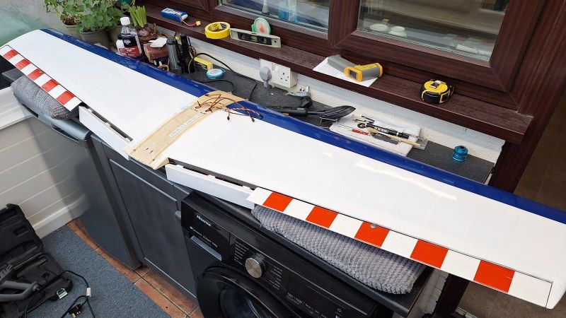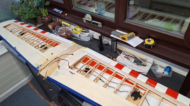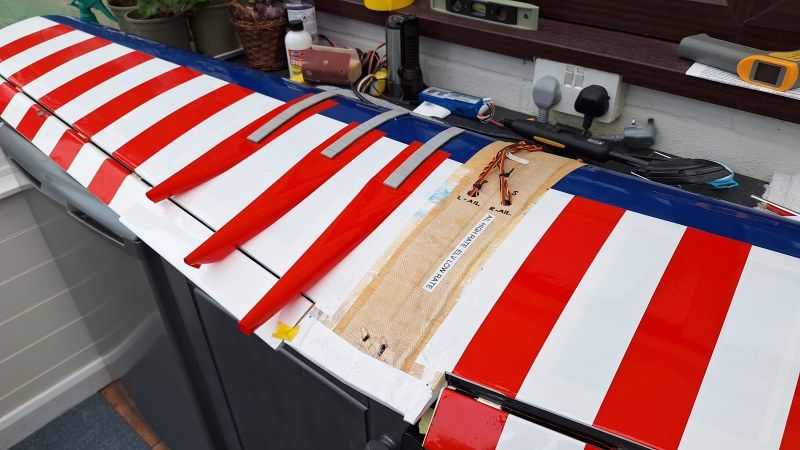 But first plug in the nav lights because once the covering is on it will be a real pain to reconnect the leads. With them connected I left them hanging loose until the all the film covering is on the glue them in with UHU Por. Starting from the trailing edge the white covering was ironed down over the sheeting and open ribs. Then heatshrunk the film. The final covering of blue from the white and rolling over the leading edge overlapping the underside blue by 20mm. A light shrink with the iron first then the heatgun to pull the leading edge nice and tight. Now I could fit the aileron servo hatches and also the flap hatches. The top surface of the wing now just needs strips of red 22 at 2.1/4 inches wide to be applied. But for now I will leave that bit of fun and move on to setting up flaps via the radio.