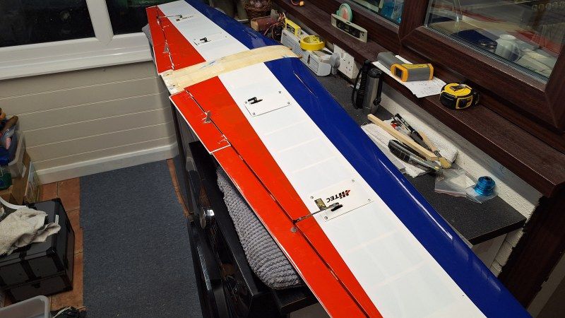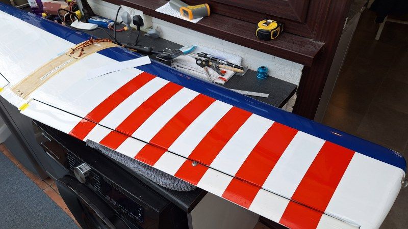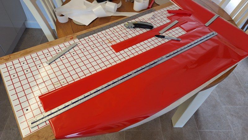 With three new rolls of Oracover, Red 22, White STD and Blue 52 time to get ironing. starting with the red underside, then the centre white strip follwed by the blue to the leading edge. Then heatshrunk using the iron at 130 degrees C. Next job was to cut out the film where the servo hatches at going to be located. Then check they fit okay.