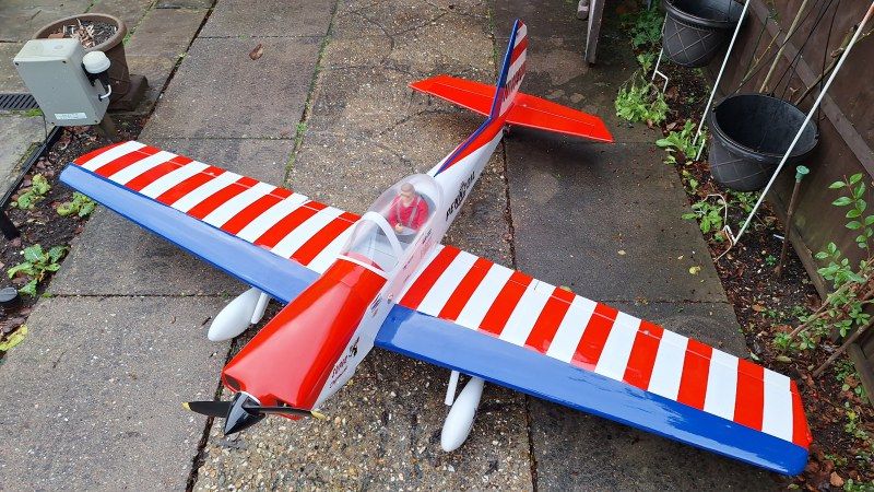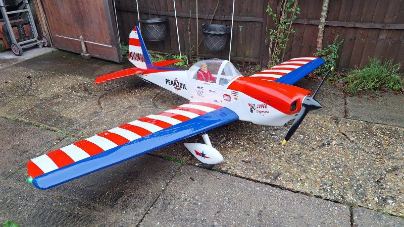 My first Super Chipmunk was Art Scholl's N114V commonly known as Pennzoil after it's main sponsor. Back in 2012 I bought it from a Guy from Stoke who I met at the Granada services on the M6 who had virtually finished it but had to give it up after his club reduced engine and/or aircraft sizes. I powered it with an ASP 180 four stroke glow engine. It did not fly regulary at our field but did fly at some model airshows. Not having flaps and being a rather floaty plane it needed a decent long runway area to land. However, it was dream to fly.